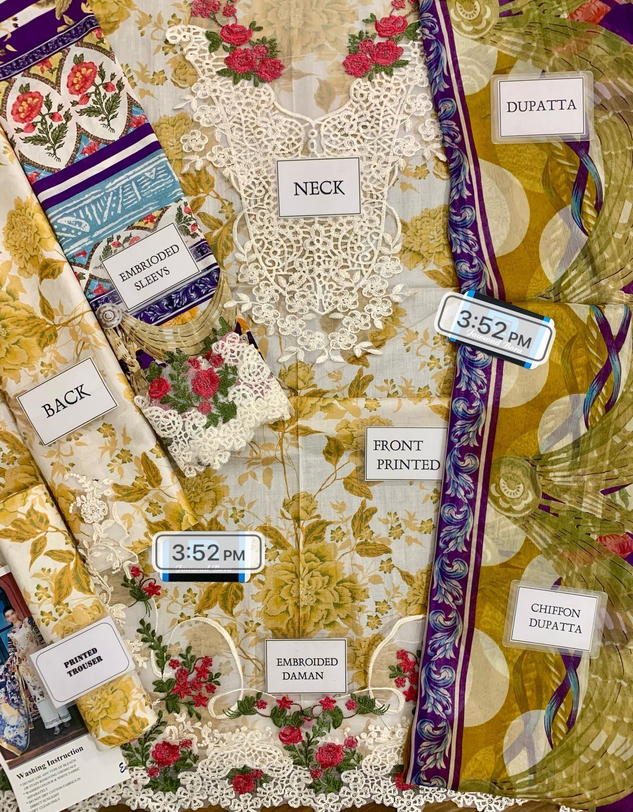 *Digital printed lawn front with heavy embroidered spengle work neckline with heavy embroidered daman boarder with embroidered daman bunches*