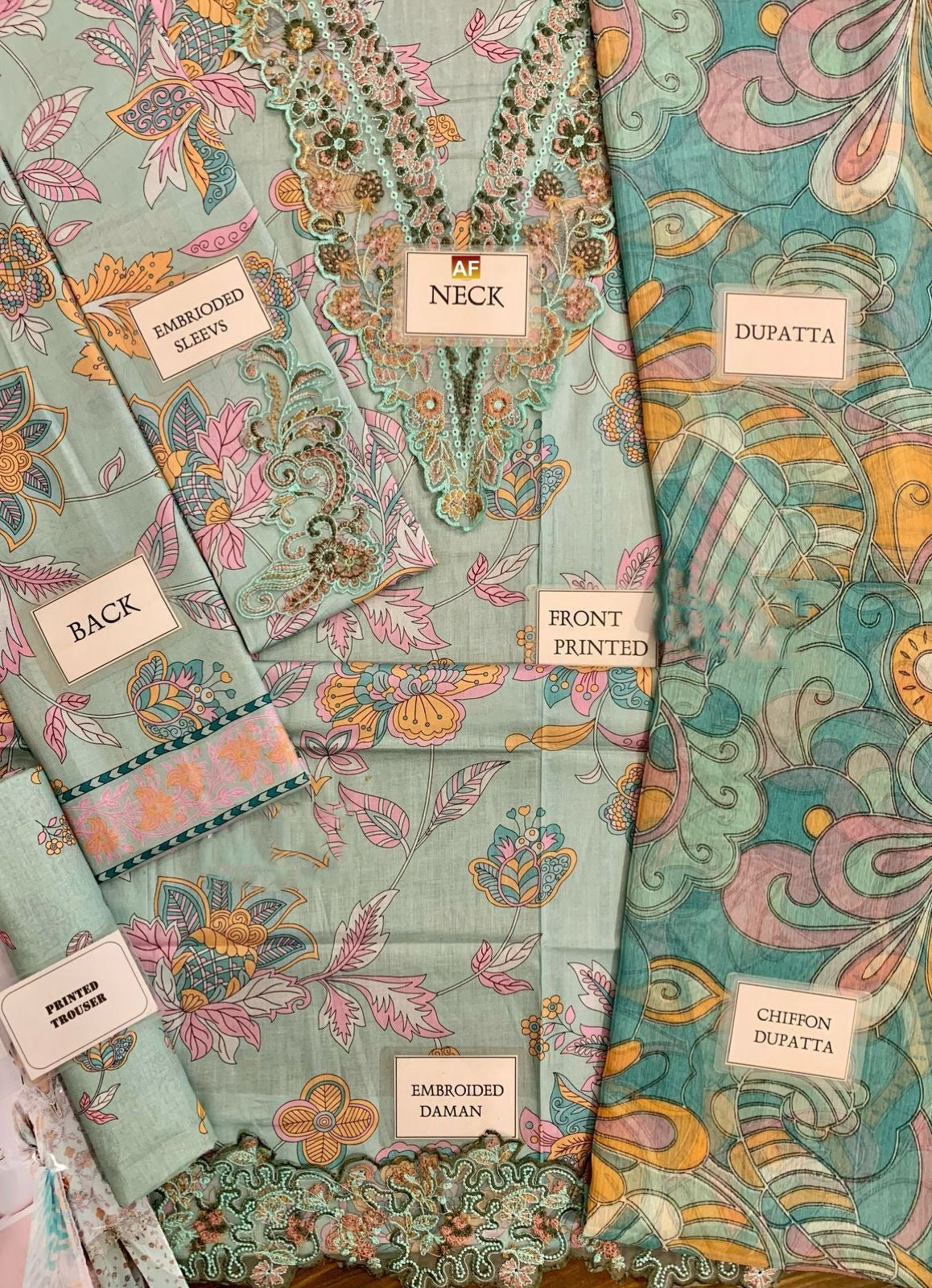 *digital printed lawn front with heavy embroidered neckline with heavy embroidered daman boarder with embroidered daman bunches*